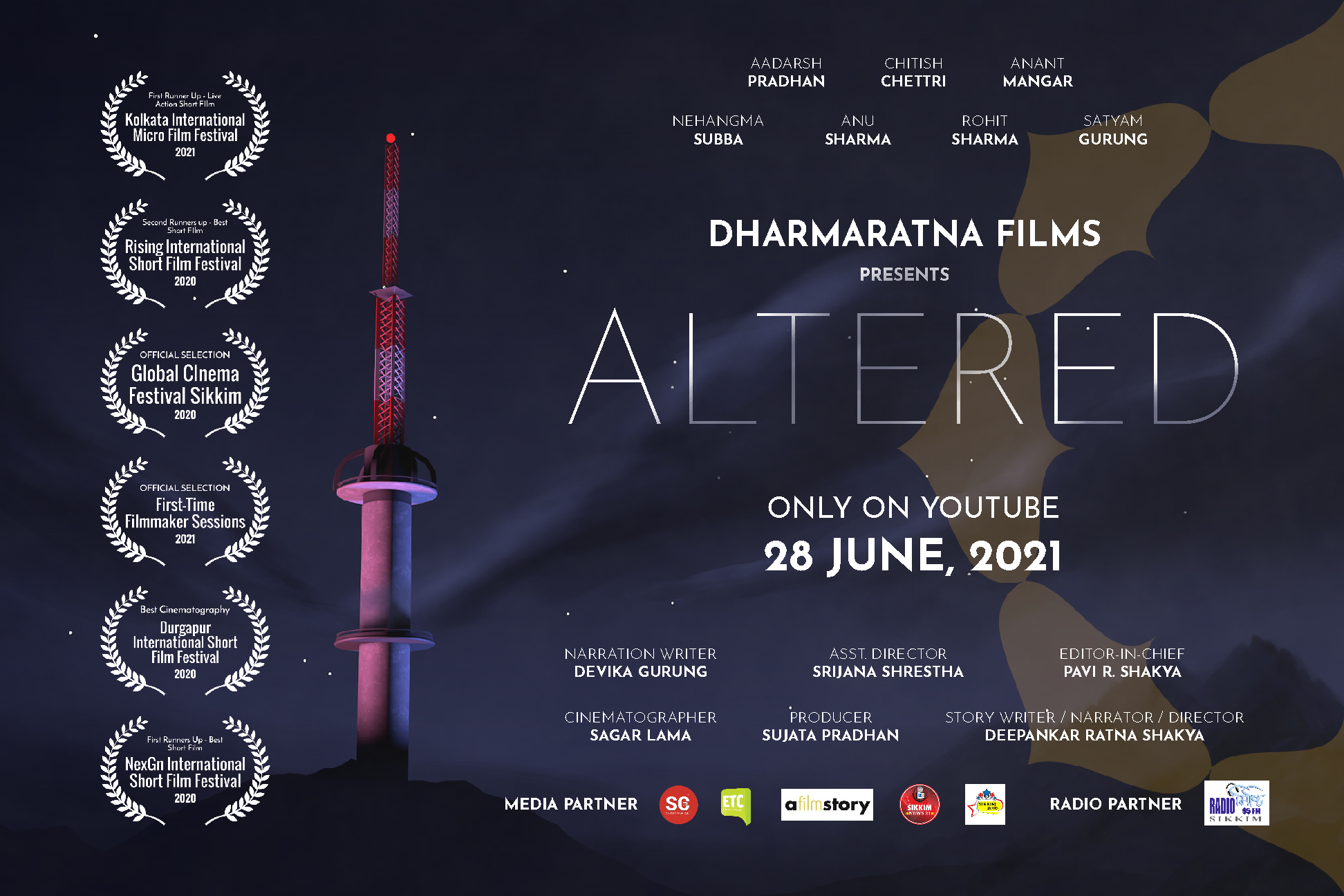 Altered is an Award-Winning Short Film from Sikkim. It bagged the First Runners-Up in Kolkata Micro Film Festival 2020, Nex-Gen International Short Film Festival 2020, and Rising International Short Film Festival in the Best Short Film category. It also bagged Best Cinematography in the Durgapur Film Festival 2020 and made an Official Selection in the Global Liftoff First-time Filmmakers Sessions, and Global Cinema Festival 2020 organized by the Film Federation of India and the State Government of Sikkim.